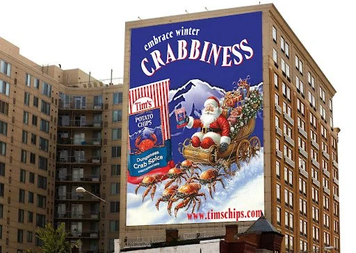 Since it’s cold in Washington State in the wintertime, we are making cozy hats and mittens to advertise the brand and make it stand out. These delightful items will be sold at stands in winter markets across Washington State. Why not add Santa into the mix? Santa and his trusted Dungeness Crabs deliver what we really want this holiday season - Tim’s Chips! Celebrate the season with Tim’s Dungeness Crab Spice Flavored Chips and hot chocolate - the perfect, cozy mix of salty and sweet.