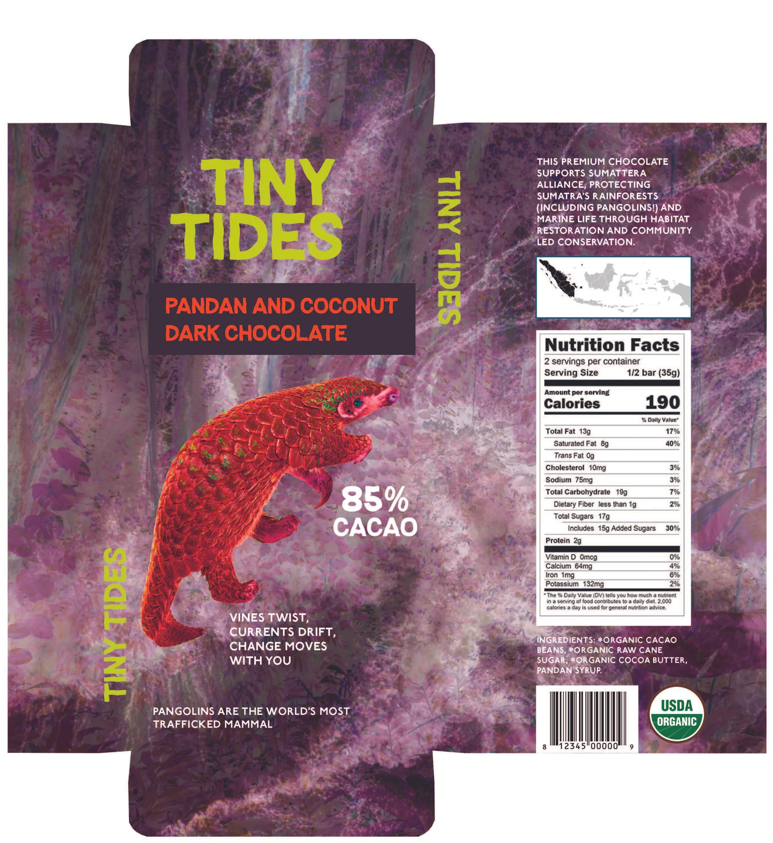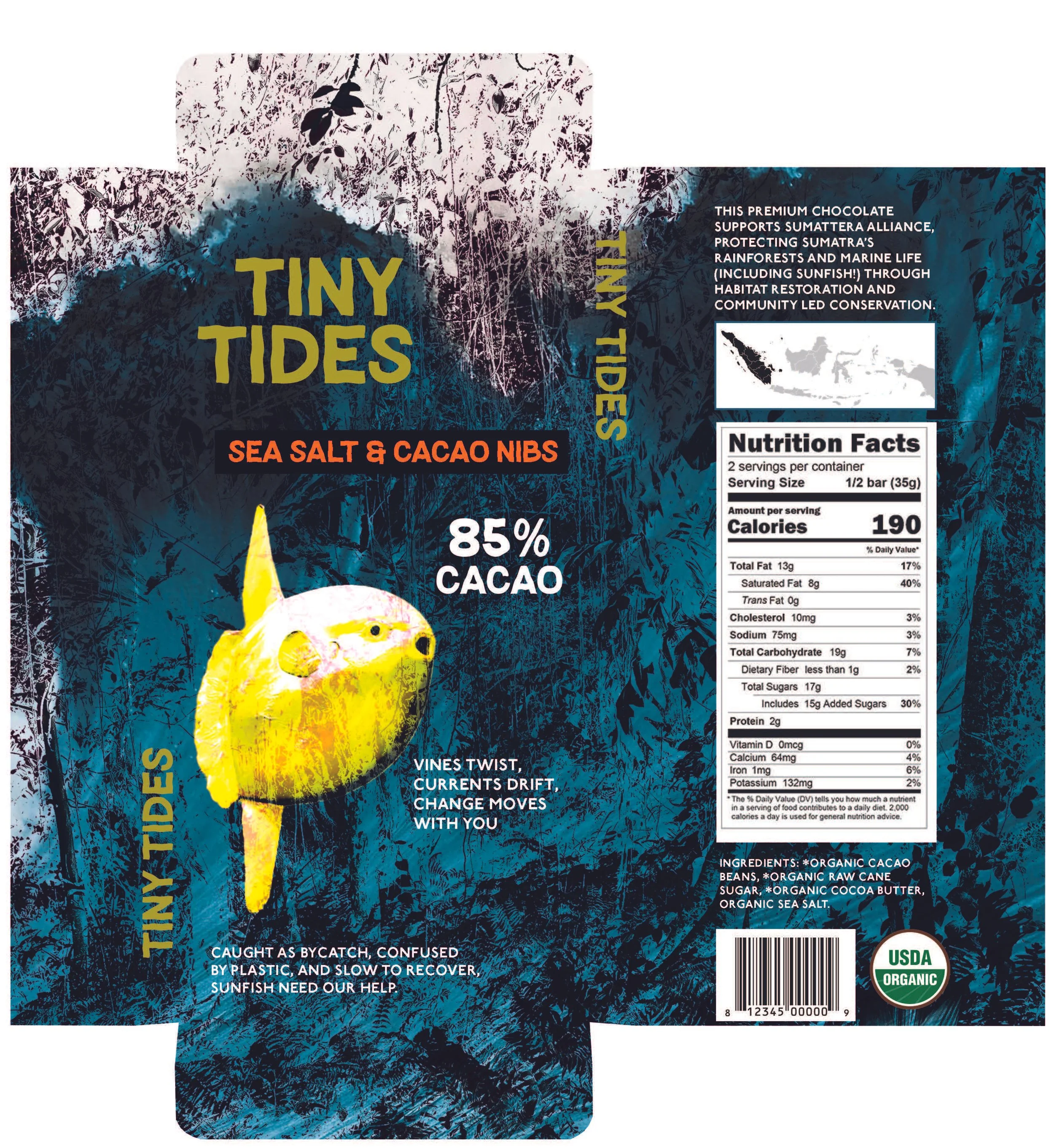 Tiny Tides Chocolate addresses both issues in a single, delicious product that consumers can feel good about. We highlight specific creatures from both land and sea that are either endangered or vulnerable, and donate to Sumaterra to protect our essential oceans and rainforests.